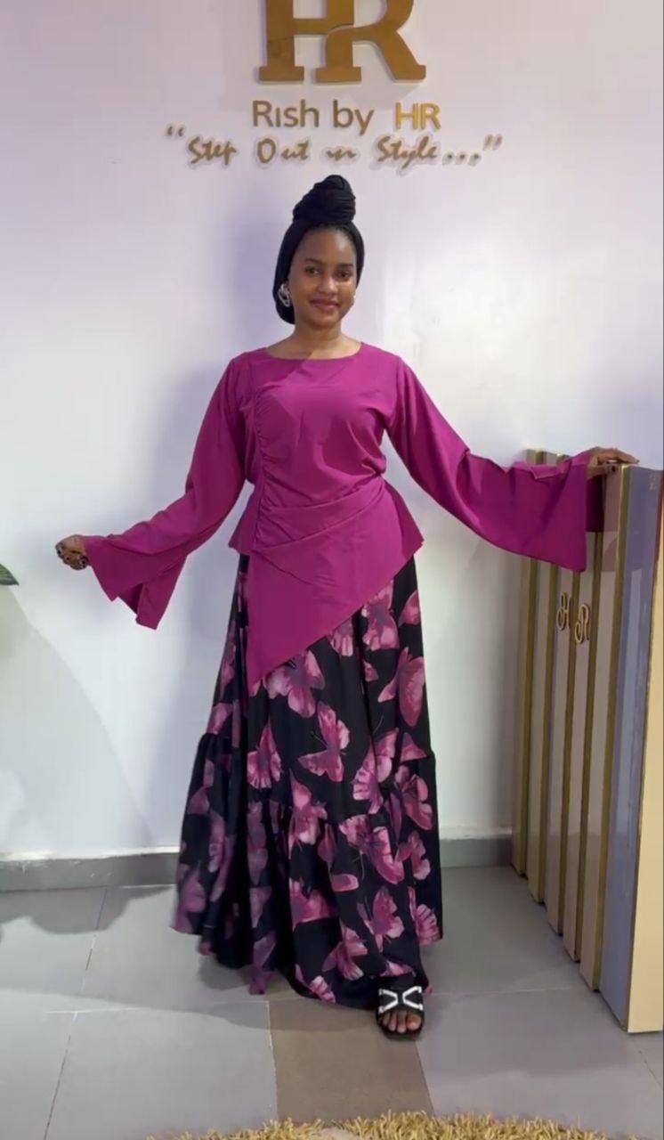 This elegant two-piece set features a flowy magenta top with flared sleeves and an asymmetrical hem, paired with a floral-print skirt. A perfect blend of comfort and class for stylish outings and events.